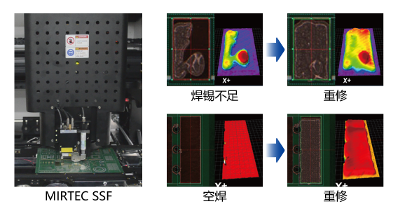 MIRTEC的**SSF(供锡功能)**使用集成于光学系统中的焊料分配器,自动修复在检查后识别出的焊料不足或无焊料的缺陷焊盘。