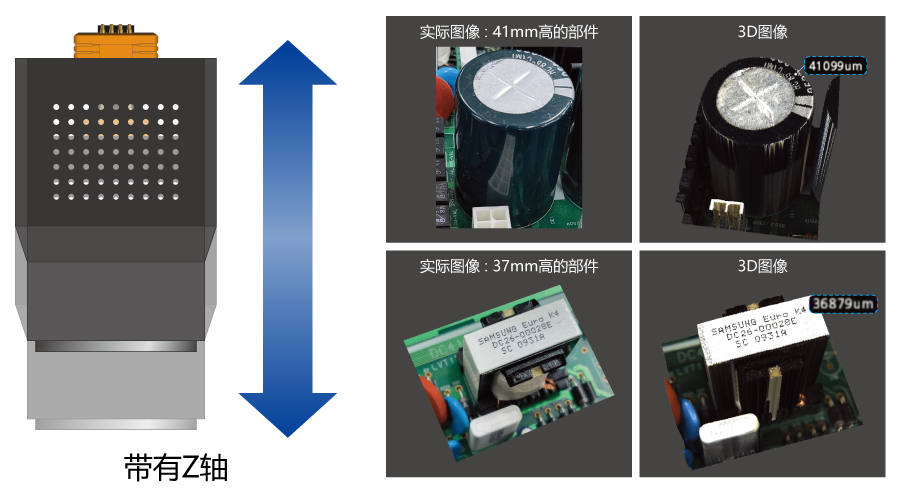 通过在光学系统中加入Z轴运动并在系统中添加GPU, MV-3 OMNI可以检测高达45mm的高部件,超过了传统3D AOI的测量限制。