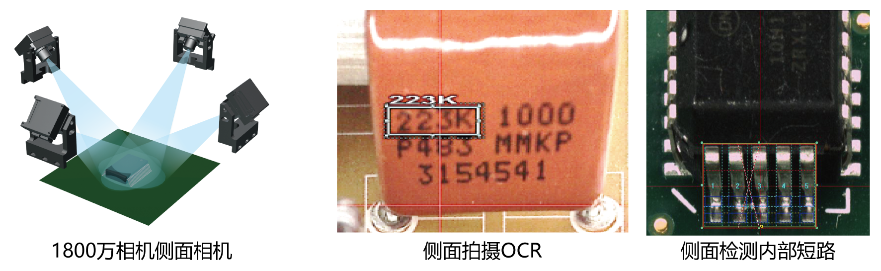 四个高分辨率侧面相机可以对J型引脚、线圈和QFN进行侧面OCR检查和焊接检查,这些都是传统自上而下检查方式不可实现的。