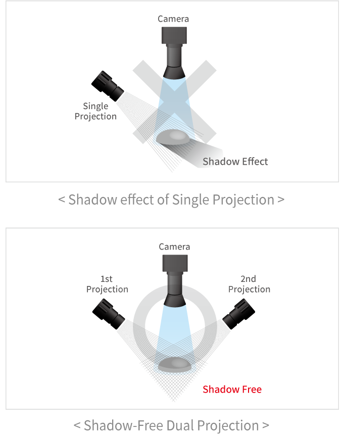 The Shadow-Free Dual Projection Moire Probe eliminates the possibility of distortion due to shadows when 3D measuring a high solder. By combining the pattern images of opposite direction, a perfect 3D measurements is possible and thus is free from reflective shadows.
